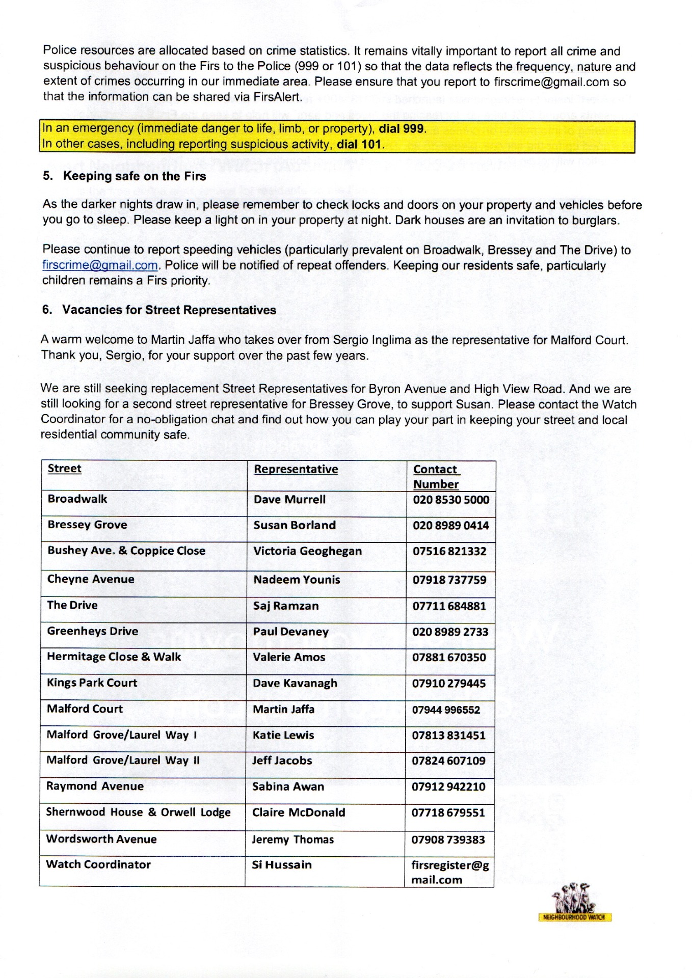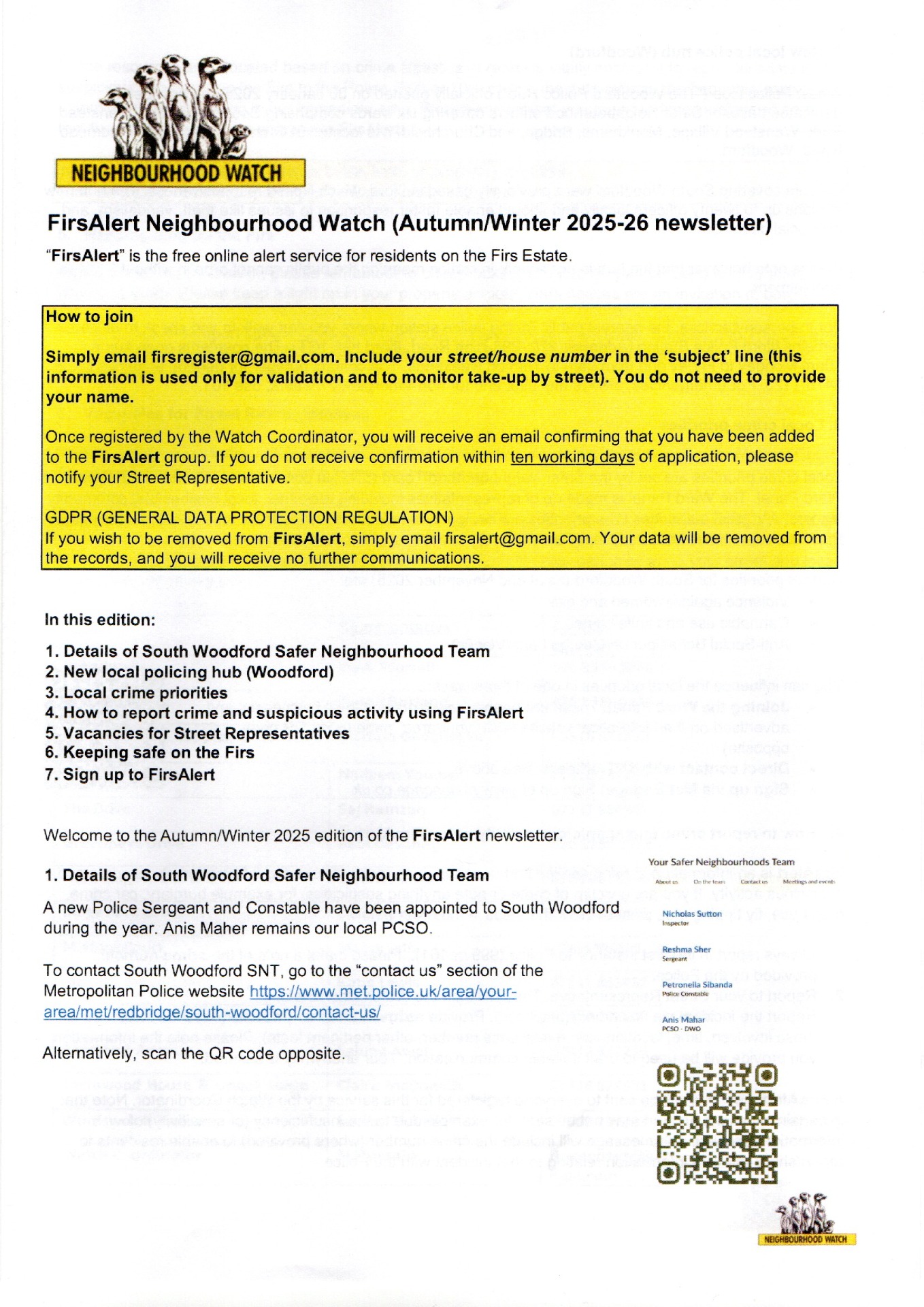 FirsAlert instant messaging was launch in 2013. 400+ residences have signed up to the service. This represents around 50% take up. Increasing the 'eyes and ears' will help keep the Firs safer by enabling the sharing of information on crimes and suspicious behaviour more widely across the Estate. If you have not yet signed up for the service, please do so. Details of how to join are on the front page. Your personal information will not be shared, and you can request removal from the service at any time.
